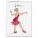 Uma jovem com cabelo loiro e vestindo um vestido vermelho, está dançando.