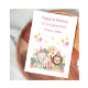 Este cartão de primeiro aniversario é adequado para filhas gêmeas, netas ou amigos. A design inclui um elefante criança, girafa e leão, balões de aniversário, presentes e chapéus.
