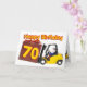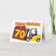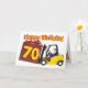 Uma empilhadeira segura uma parcela com a idade nela inscrita em letras amarelas brilhantes. Um cartão de aniversário alegre e engraçado para um homem.