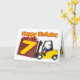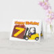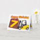 Uma empilhadeira segura uma parcela com a idade nela inscrita em letras amarelas brilhantes. Um cartão de aniversário alegre e engraçado para um homem.