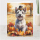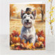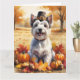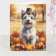 Uma pintura em estilo aquarela de um cachorro alegre sentado em meio a uma pilha de folhas vibrantes de outono, cercado por pequenas abóboras e bolotas espalhadas. O cachorro usa um pequeno chapéu de peregrino e irradia alegria, capturando o espírito do Dia de Ação de Graças. Ao fundo, campos de colheita suaves e árvores douradas criam uma atmosfera tranquila de campo. Texturas suaves e tons outonais quentes e suaves dão à cena um sentimento aconchegante e nostálgico, perfeito para celebrar a beleza da estação.