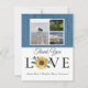 Chic Sunflower Love Elegante Yellow e Dusty Blue Wood- White Script Foto Collage com Cartões de agradecimentos de Colagem de Casamento, apresentando uma imagem sobre uma colagem de 3 de suas fotos.