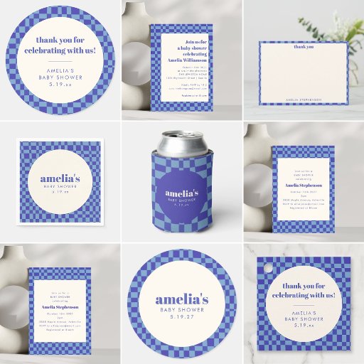 This baby shower thank you note features a soft cream front with classic serif typography framed by a playful blue checkerboard border. The coordinating checkerboard back adds a modern, graphic touch that feels fun yet polished. Designed to feel thoughtful and personal, it’s perfect for thanking guests after a baby shower in a way that feels stylish and intentional. Personalize the name on the front to create a meaningful keepsake for friends and family.