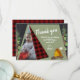 Tenda de acampamento com obrigado de cartão plano. Uma tenda de acampamento verde, com árvores de aquarela e uma fogueira sob um céu noturno estilo chalkboard. xadrezes de búfalos vermelho e preto. Alterar texto como preferido.