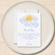 O cartões de agradecimentos de chá de fraldas deste menino bonitinho é decorado com um sol amarelo, nuvens e tipografia azul na moda. Facilmente personalizável. Original Watercolor © Michele Davies.