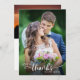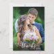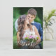 Diga obrigado aos seus convidados de casamento com este cartões de agradecimentos de fotos moderno. O design apresenta o texto "Amor e obrigados" em estilo elegante e escrito à mão branca. A foto na frente é a orientação vertical e a foto na parte traseira é horizontal. O backside oferece texto personalizado para sua mensagem de obrigado pessoal.