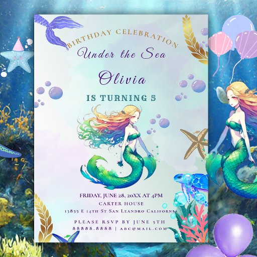 Sereia Roxa sob o Mar com Criaturas do Mar. "Junte-se à celebração submarina com esse convite de aniversário encantador de roxo e sereia de ouro. Uma bela cauda de sereia e uma cena do mar balbuciana, fazer um ajustado perfeito para qualquer dia especial de sereia.