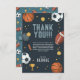 Este design de aniversário de criança com tema desportivo legal e moderno apresenta uma ilustração desportiva azul, com basquete, futebol, bola de futebol, raquete tênis, troféu e estrelas. O cartão pode ser personalizado com o nome dos seus rapazes e o obrigado da sua mensagem.