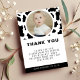 Festa de primeiro aniversario de impressão de vaca branca e negra, obrigada. Design de Unisex para rapazes e raparigas. Personalize-o com os detalhes do seu evento e uma foto do convidado de honra.