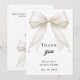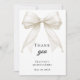 Um agradecimento moderno e elegante para Quinceañera. Um fundo branco, decorado com um grande laço de cor marfim com pérolas. Na frente, o texto: Obrigado, nome e data.