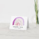 Cartões modernos de agradecimento com arco-íris, apresentando um arco-íris em aquarela na frente em tons de roxo, rosa e bege com "Obrigado" exibido abaixo em letras pretas. Personalize o cartão de agradecimento com arco-íris adicionando seu nome ou texto personalizado. O interior do cartão é em branco com muito espaço para sua mensagem de agradecimento digitada ou manuscrita. A parte de trás do cartão de agradecimento dobrado apresenta um padrão de arco-íris correspondente. O cartão de agradecimento com arco-íris em aquarela é perfeito para usar em chás de bebê, festas de aniversário e muito mais!