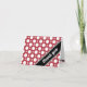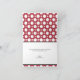 Cartões de agradecimento com um padrão de bolinhas sortidas com tamanhos alternados de círculos brancos sobre um tom vermelho estilo café. "obrigado" é impresso diagonalmente em branco na frente sobre uma faixa preta diagonal no canto inferior direito. O interior é impresso personalizado com o seu próprio texto, ou pode ser facilmente deixado em branco para escrever à mão as suas próprias expressões de gratidão. Ao redor desta área de texto modelo está o mesmo padrão de bolinhas sortidas, um elemento único em oposição ao típico interior branco. Este estilo e esquema de cores tornam estes cartões uma escolha apropriada para Chás de Panela, Chás de Bebê e Aniversários.