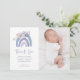 Esses adoráveis cartões de agradecimento para chá de bebê apresentam estilo boho e uma caligrafia manuscrita na moda. Um arco-íris pintado de azul empoeirado e roxo fofo é decorado com flores de aquarela combinando em um fundo branco simples. Adicione a foto do seu bebê para completar o design. Este adorável cartão de agradecimento será a maneira perfeita de dizer obrigado em qualquer época do ano. Também é perfeito para um Batismo ou Batizado.