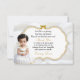 Linda menina de vestido branco e de ouro. O fundo do convite é uma placa branca com uma estrutura dourada e cintilante prateada e um embelezamento do arco. A parte de trás é enfeitada com padrão de flores douradas e fita dourada sobre fundo branco de cetim.