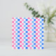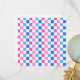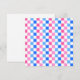 A checkerboard pattern of pink, blue, and white squares creates a vibrant and lively visual effect, conveying playfulness and energy.