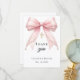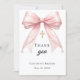 Um cartão de agradecimento de Batismo moderno e elegante. Um fundo branco, decorado com um grande laço cor-de-rosa com pérolas e uma cruz dourada. Na frente, o texto: Obrigado, nome e data.