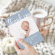 Este simples e na moda Baptismo ou cartões de agradecimentos de Natal apresenta uma foto do seu bebê, com elegante e moderna tipografia branca e uma cruz correspondente sobre um fundo azul macio.