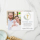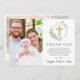Um cartões de agradecimentos de batismo elegante e simples. A frente mostra sua foto, uma ilustração aquática de uma cruz de ouro em uma coroa dourada enfeitiçada com eucalipto verde e "Obrigado" em um sábio verde e moderna tipografia. Personalize seu obrigado e adicione seus nomes em um script de caligrafia. No verso, adicione três fotos adicionais e um obrigado adicional que você envia, benção, citação de bíblia, etc.