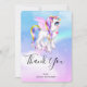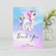 Cartões de agradecimentos com a imagem de um unicórnio com grandes olhos azuis, asas cor-de-rosa e um mano e cauda arco-íris. Kawaii fofo.