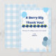 Um doce cartão de agradecimento temático de mirtilo para mostrar apreço aos convidados por tornar a celebração de aniversário do seu filho inesquecível.
