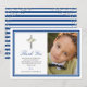 Elegante primeira comunhão sagrada agradeço cartas com um simples fundo branco que pode ser mudado para qualquer cor, uma fronteira dupla azul marinho, uma cruz prateada religiosa com flores brancas, uma foto de seu filho, e um obrigado moderno que você modelo é fácil de personalizar.