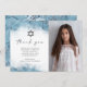 Este elegante bar fotográfico moderno ou cartões de agradecimentos bat mitzvah apresenta um design de borda azul-clara com a imitação de mármore veinado com folha de prata falsa, desaparecendo gradualmente no fundo branco. Uma pequena Estrela de David aparece acima das palavras "obrigado você" em um roteiro de escrita manual de cinzas de carvão, com uma mensagem editável abaixo em maiúsculas de serifas. Substitua facilmente a imagem de exemplo pela sua foto favorita. O verso apresenta um design de mármore azul e prateado correspondente.