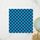 Blue and black checkerboard pattern with evenly spaced squares. The image conveys a sense of order and symmetry, with a vibrant color contrast.