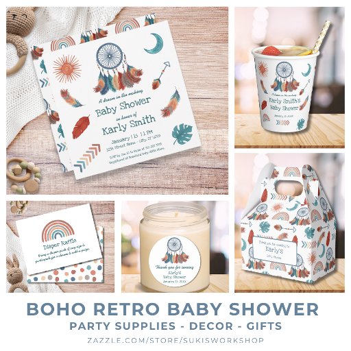 Adorável cor d'água, estilo bô, desenhado à mão, sol e lua em boho, cores retrógradas em fundo branco. Design apresenta elementos Boho adicionais desenhados à mão, tais como uma caçadora de sonhos, penas, folhas e setas. Fontes alegres e divertidas para cartões de agradecimentos de Chá de fraldas. A parte traseira do cartões de agradecimentos apresenta um padrão uniforme feito com os mesmos elementos de inicialização, cores e fundo que a parte frontal da placa. Design faz parte da Coleção de Chás de fraldas Boho, que inclui fundo alternativo, convites adicionais, além de material de papelaria adicional e mais material de festa com cores retrorreflectoras e desenhos correspondentes da Suki. Todos os direitos reservados.