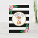 Um cartões de agradecimentos com ilustração de uma raposa bebê vestindo uma coroa floral sobre um fundo listrado preto e branco com designs florais no canto superior esquerdo e inferior direito. Os convites para chuveiros de bebês combinam com os pontos de coordenação estão disponíveis na Paperie de Jill.