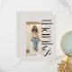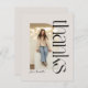 Bold e moderno, esta graduação de uma foto, obrigado, é a maneira perfeita de mostrar sua apreciação por presentes e apoio na graduação. Apresentando uma foto arquivada na frente, um ousado e moderno "obrigados" e um script de assinatura personalizado, este design também tem espaço no verso para uma mensagem digitada ou pode ser deixado como vazio para o formando escrever manualmente notas personalizadas de agradecimento. Este design de cartões de agradecimentos de graduação é parte de uma coleção de Lea Delaveris Design, onde você pode encontrar a coordenação de anúncios de graduação, convites e suprimentos de festa de formatura e mais cores e estilos.
