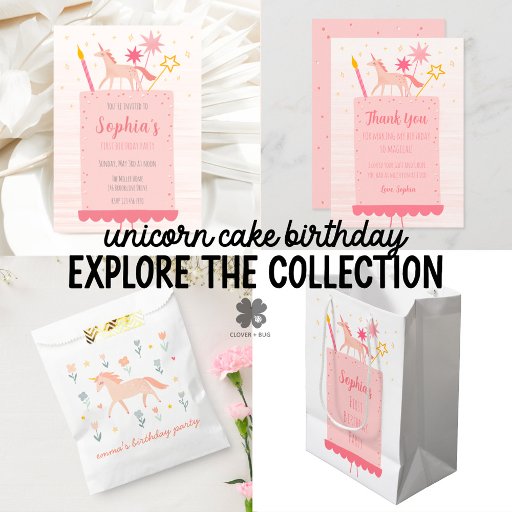 Design de bolo de aniversário de unicórnio rosa para agradecer aos convidados por tornar sua festa mágica. Design único apresenta cores rosadas e pastéis e decorações de unicórnio e estrela no topo do bolo. Ótimo para festa de aniversário de menina, ou para qualquer um! Personalize facilmente este design com os detalhes da sua festa! Confira nossa coleção correspondente para itens coordenados.
