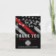 Este design apresenta uma bandeira de bombeiro com listras pretas e brancas e uma fina faixa vermelha também. Este cartões de agradecimentos é excelente por mostrar apreço e agradecimento a um bombeiro, tenente, capitão, ou chefe por seu serviço.