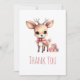 Cartões de agradecimentos com uma ilustração de um adorável veado bebê. Olhos grandes orelhas com cabeça grande e pequenos galhos castanhos. Vestindo um grande arco vermelho. Ao lado de uma pilha de presentes.