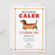 Este convite de aniversário apresenta um retrato de aquarela fofo de um cão dachshund vestindo uma fantasia de cachorro-quente.