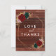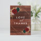Este elegante e rústico cartões de agradecimentos de casamento apresenta uma rica paleta colorida de burgundy, verde esmeralda e sotaques dourados. A design apresenta um fundo de madeira com uma estrutura geométrica de ouro, adornada com um arranjo floral de rosas vermelhas vibrantes, folhas verdes profundas e delicados sotaques de ouro. As palavras "AMOR e OBRIGADOS" são escritas elegantemente dentro do quadro, completando esse cartões de agradecimentos de coração e na moda.