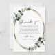Eucalyptus, Dourada Caligrafia Branca, Cartões de agradecimentos de Casamento... Nosso cartões de agradecimentos de casamento de eucalipto com caligrafia moderna apresenta uma estrutura oval metálica dourada embelezada com folhas de eucalipto verde sábio e abraçadas com esmeraldas, junto ao seu obrigado você envia mensagem e noiva e assinaturas de noiva e noivo em um fundo branco nítido. A parte de trás do cartão é uma cor de sábio clara mostrada dentro das próprias folhas. Todo texto de exemplo (além dos gráficos de caligrafia) pode ser facilmente revisado com suas próprias informações sobre o modelo de personalização. Parte de uma suíte de casamento com acessórios coordenadores no mesmo tema de ouro de ouro de eucalipto.