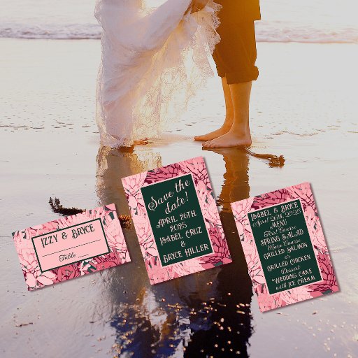 O rosa e o verde foi uma das combinações de cores mais populares da década de 1980, e muitas vezes apareceu em um design abstrato. Aqui as cores são aprofundadas e combinadas com duas fontes elaboradas para casamentos elegantes e de clima quente.