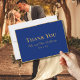 A simplicidade deste cartões de agradecimentos elegante é bela. O design apresenta uma fina e minimalista margem de ouro irregular com tipografia de ouro para personalizáveis Obrigado, Sr. e Sra. Sobrenome e data de casamento. Trás de cartas de agradecimento foi intencionalmente deixado vazio, para você adicionar uma nota manuscrita para sua família e amigos. Recomendação do Designer: use um marcador fino em ouro para legibilidade e contraste para o fundo azul real.