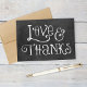 O modelo de cartões de agradecimentos de casamento do estilo "Obrigado de amor e " dobrado apresenta texto estilizado com uma aparência de giz branco manuscrito em uma imagem de fundo do estilo de quadro negro texturizado, bem como uma mensagem que pode ser personalizada no dentro do cartão.