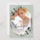 Eucalyptus Dourado Elegant Script QR Code Sage Green Photo Wedding Cartões de agradecimentos... Nosso elegante cartões de agradecimentos de casamento com fotos de eucalipto apresenta uma estrutura oval metálica dourada embelezada com folhas de eucalipto abarrotadas de esmeraldas junto a uma foto da noiva e do noivo em um fundo verde-claro. Sua foto será colocada em uma camada abaixo de uma transparência branca para "esmaecer" as cores na parte inferior para que o texto "Obrigado" e os nomes de noiva e noiva sobrepostos no topo possam ser lidos. A parte traseira do cartão exibe a redação que você pode manter ou revisar para sua mensagem de obrigado pessoal, além de um exemplo de código QR que você pode revisar facilmente com o seu próprio link de casamento de código QR. Todo texto de exemplo (e o código QR) pode ser facilmente revisado com suas próprias informações sobre o modelo de personalização. Parte de uma suíte de casamento com acessórios coordenadores no mesmo tema de ouro de ouro de eucalipto.