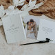 Projetado para combinar com nossos convites de casamento em linha. Um belo design de cartões de agradecimentos dobrado, baseado em tipografia, com uma sensação minimalista, com "gratidão" e duas linhas de texto personalizado em moderno guião manuscrito e letras clássicas de serifa em preto e branco, acentuadas com detalhes finos na linha vertical. Adicione texto personalizado adicional ao dentro, bem como um retrato ou uma foto vertical.