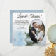 Estes belos cartões de agradecimento de casamento são uma maneira maravilhosa de mostrar seu apreço aos seus amigos e família por celebrar com você no seu dia especial. Eles apresentam a sua foto de casamento em uma moldura oval com um solteiro longo e pálido, azul ou azul-pálido, deitado do lado dele refletindo na água. O título diz "Obrigados e amor" com espaço para uma nota e assinatura personalizadas. Clássico, romântico e sofisticado, estas cartas são a forma perfeita de concluir a sua celebração de casamento.
