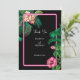 Uma moderna, mas retrorada, botânica tropical rosa-néon em fundo negro. Um belo design de casamento ideal para o verão. Design de plantas tropicais, cor-de-rosa, néon perfeito, com palmeiras, flores de Hibiscus cor-de-rosa e flores de Plumerias Frangipanis. As cores pretas, cor-de-rosa e verde dominam este design de neon rosa tropical. A tipografia da caligrafia moderna contrasta perfeitamente com o tema design do casamento preto e rosa. Um design de casamento elegante com elementos simples modernos. Também estão disponíveis itens de papelaria de casamento e outros formatos de convite de casamento.