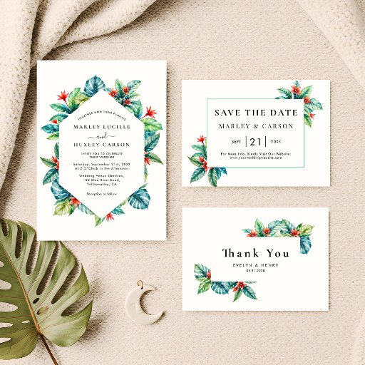 Cartão De Agradecimento Casamento de Verão com Folhas Tropicais de Aquarel