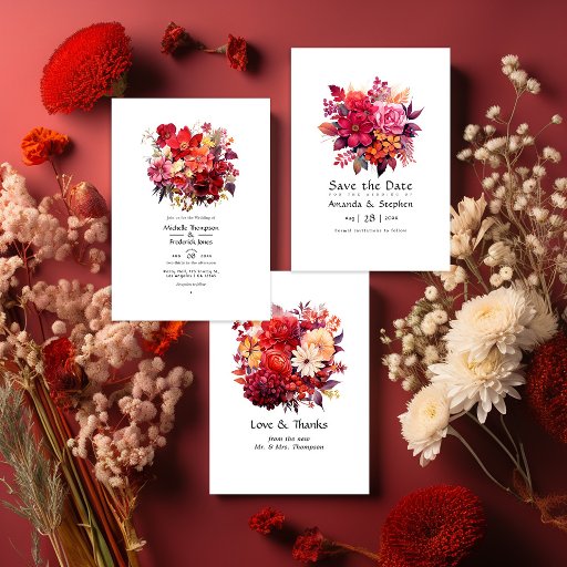 Cartões de agradecimentos de casamento floral vermelho. Ideal para um casamento no jardim.