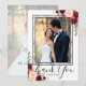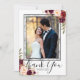 Cartões de agradecimentos Elegante De Foto De Casamento - Cor De Água Floral Vermelha Burgundy, Moldura De Cinza Com Design De Letra Preta. Disponível exclusivamente em www.zazzle.com/monogramgallery. Personalize com as suas fotografias (frente e verso) e obrigado que envie SMS para fazer o seu casamento, obrigado cartas especiais e exclusivos para obrigado dos seus convidados de casamento. Perfeito para seu casamento outono, casamento rústico, casamento floral e temas de casamento burgundy. Use os prompts de modelo ou clique em "personalizar" e tenha mais liberdade para personalizar seu cartão.