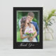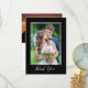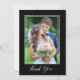 Obrigado seus convidados de casamento com este elegante cartões de agradecimentos de 2 fotos. O design apresenta uma foto vertical e um script de na moda "Obrigado" em um fundo preto. A parte de trás oferece uma segunda foto que é texto horizontal e personalizado para sua mensagem de obrigado pessoal.
