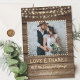 Sua foto de casamento é acentuada com um fundo rústico, country, de prancha de madeira marrom e luzes de cordas amarelas suaves junto com o título de LOVE & OBRIGADOS e sua data de casamento em uma fonte impressa à mão ocidental do país e seu nome em uma fonte de script de escova grossa. A parte traseira da placa apresenta o mesmo plano de fundo de madeira e oferece um lugar para digitar uma mensagem genérica de obrigado (ou excluir o texto de amostra para deixar o vazio do obrigado pessoal manuscrito que você tem). DICA DA FOTO: Para obter resultados mais rápidos/melhores, escolha uma foto com o assunto no meio e/ou pré-plante para uma forma quadrada ANTES de carregar e ela preencherá o espaço de fotos perfeitamente. Entre em contato com o designer se quiser personalizar ou coordenar itens.