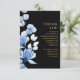 Um cartão de agradecimento de funeral elegante preto e dourado decorado com flores azuis, personalizado com sua própria mensagem de agradecimento e uma foto do ente querido no verso. Criado por Thisisnotme©