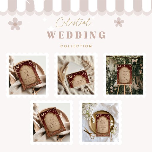 A luxurious celestial wedding design framed in deep burgundy and antique gold. This ornate baroque invitation features glowing moons, stars, and cosmic filigree — blending old-world romance with a touch of divine mystery. Perfect for celestial, gothic, or royal-themed weddings seeking a timeless yet magical aesthetic.